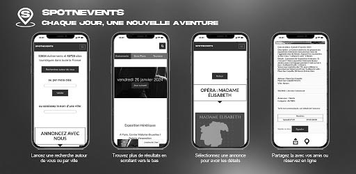 Spotnevents vous permet par un simple clic de découvrir les évènements autour de vous façon agenda. Il ne vous reste qu’à faire défiler expos, concerts, bons plans, etc... Avec + de 65 000 évènements et + de 50 000 sites touristiques, la plateforme couvre l’ensemble du territoire métropolitain et est déjà présente dans plus de 12 pays !!!